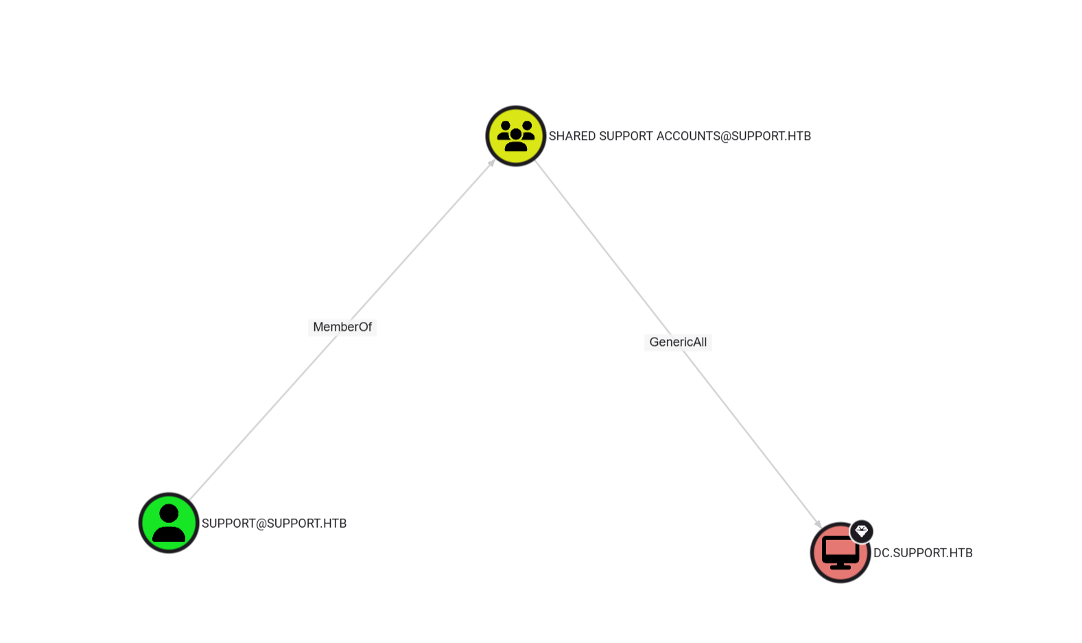 By looking at the bloodhound output, now we can notice that the support user has GenericWrite over the domain controller.