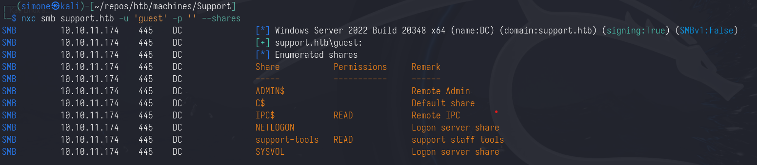 | nxc smb support.htb -u 'guest' -p '' --shares
