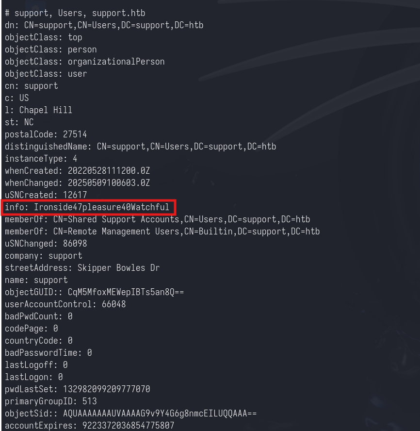 Here we can notice that the user support has the info parameter populated by a string. This is the plaintext password of the support user.