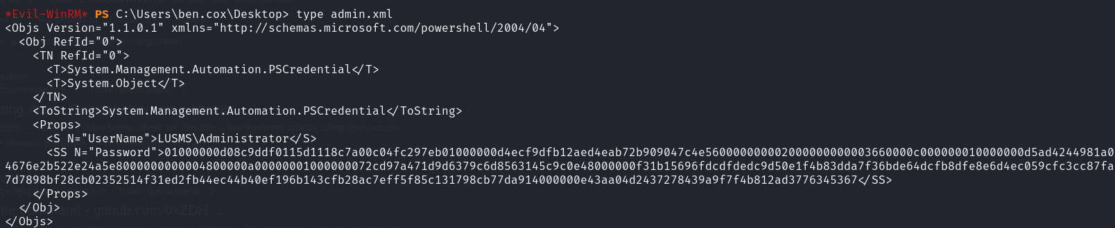Inside the Desktop folder of ben.cox there is an xml file that stores the Administrator password in the PScredentials format: