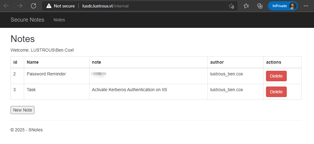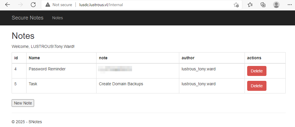 svc_web is indeed vulnerable and the hash can also be cracked. Using ben.cox we can also access the website exposed on port 80 on LusDC since it relies on SSO. It is an application used for storing plaintext notes, and therefore it may contain valuable information. In fact, the password of the user ben.cox can be found here. Altough we already have this password, this is an hint at looking at notes created by other users.