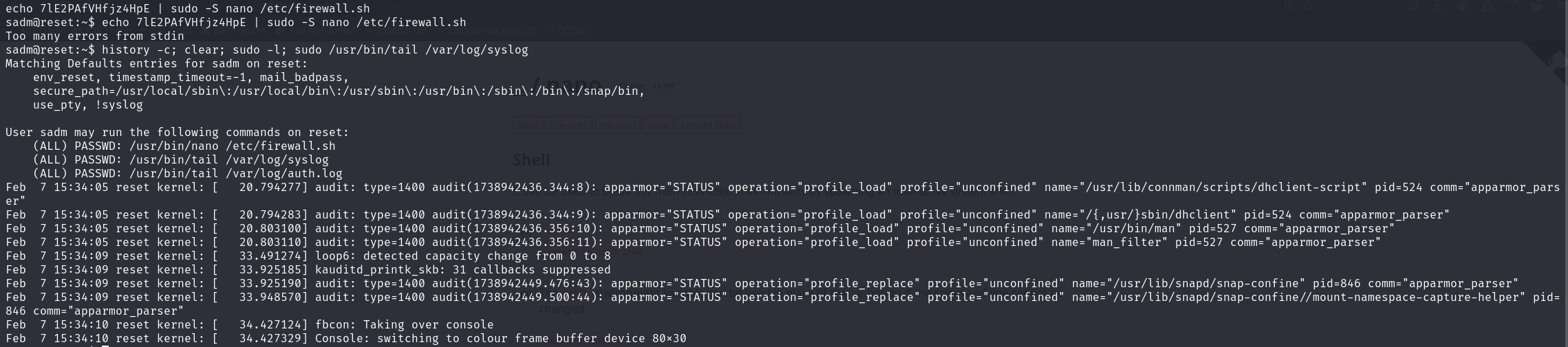The tmux session contains the plaintext credential for the user sadm and reveals that we can run nano as root.